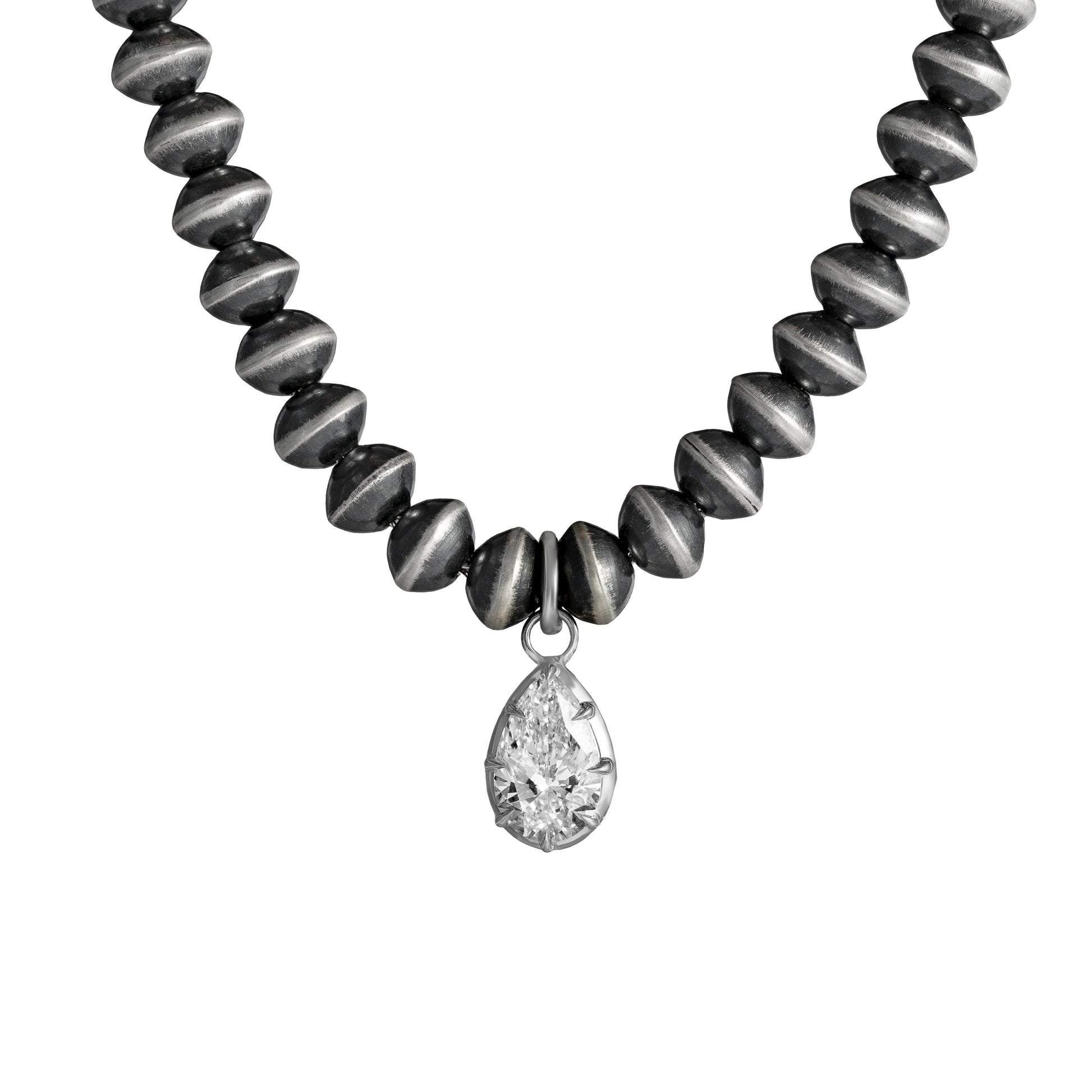 Elevate your jewelry collection with our exquisite handmade Navajo pearl necklace created in collaboration with 1806 & Co., featuring a stunning 2 carat lab-grown pear diamond pendant in an elegant Georgian cut-down setting. This unique piece beautifully marries traditional craftsmanship with modern sustainability and design, making it the perfect statement accessory for any western fashionista.