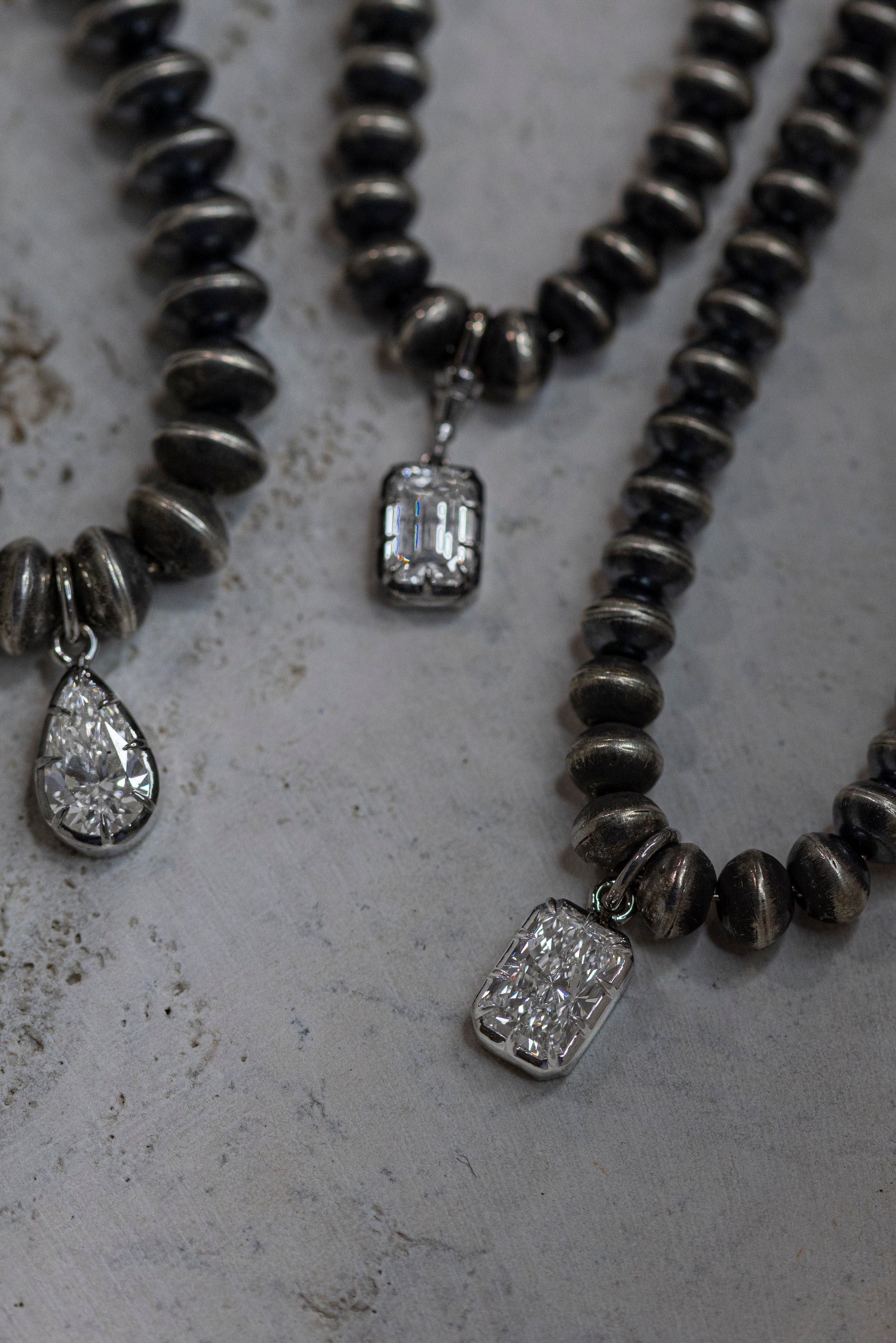 Elevate your jewelry collection with our exquisite handmade Navajo pearl necklace created in collaboration with 1806 & Co., featuring a stunning 2 carat lab-grown pear shaped diamond pendant in an elegant Georgian cut-down setting. This unique piece beautifully marries traditional craftsmanship with modern sustainability and design, making it the perfect statement accessory for any western fashionista.